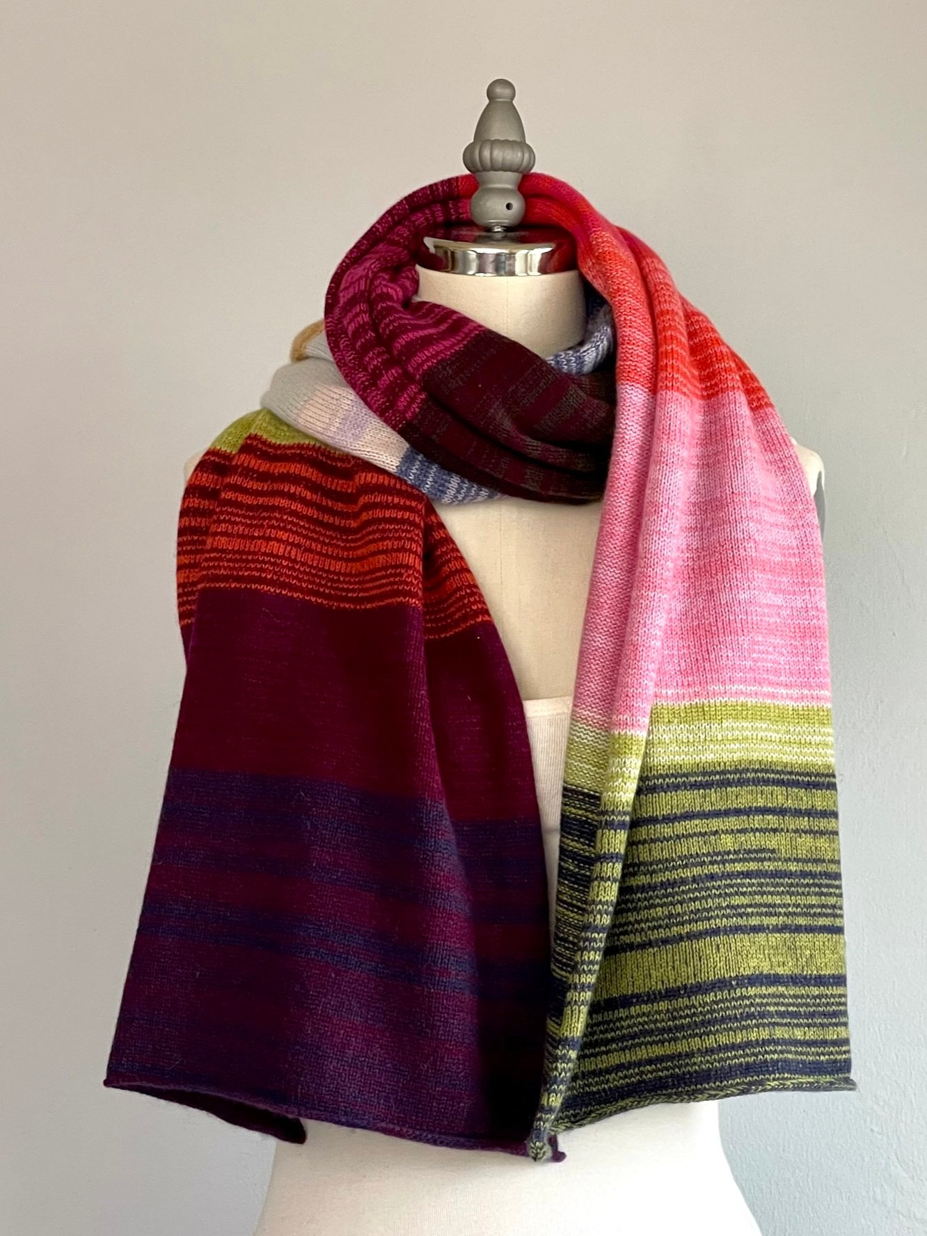 Written patterns of a big scarf, and neck warmer, are included in the class for students to practice the techniques covered.