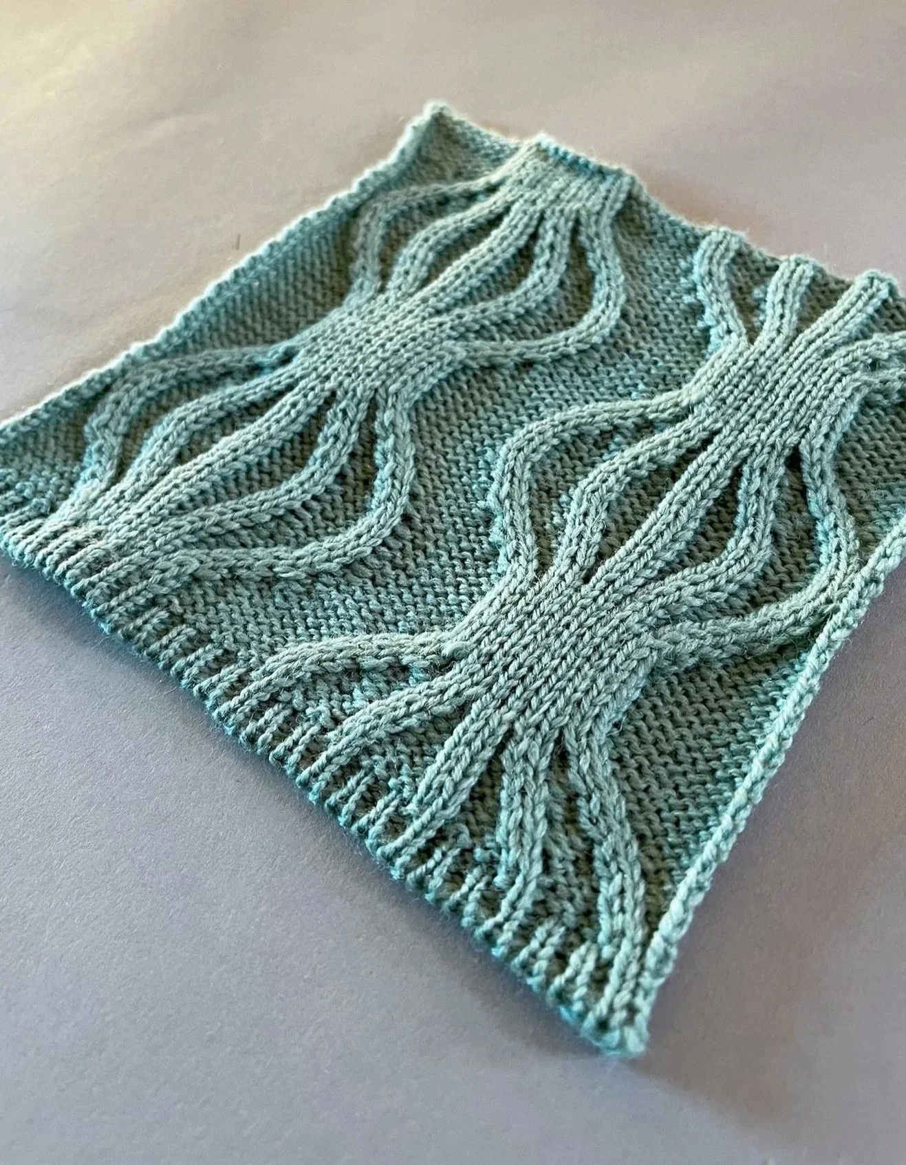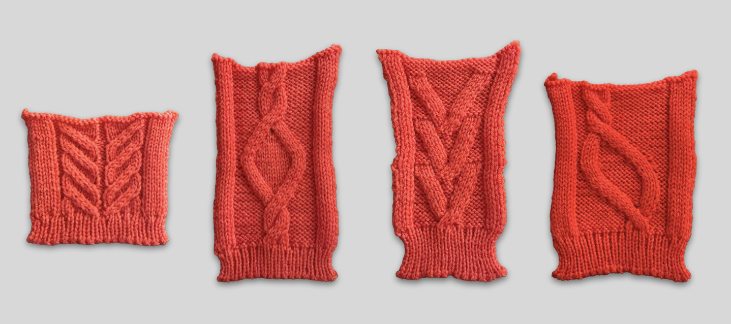 Both tuck stitches and plating can add interest to a cable design and we will look at these two techniques now. We will also talk a little bit about calculating tension for cable projects.