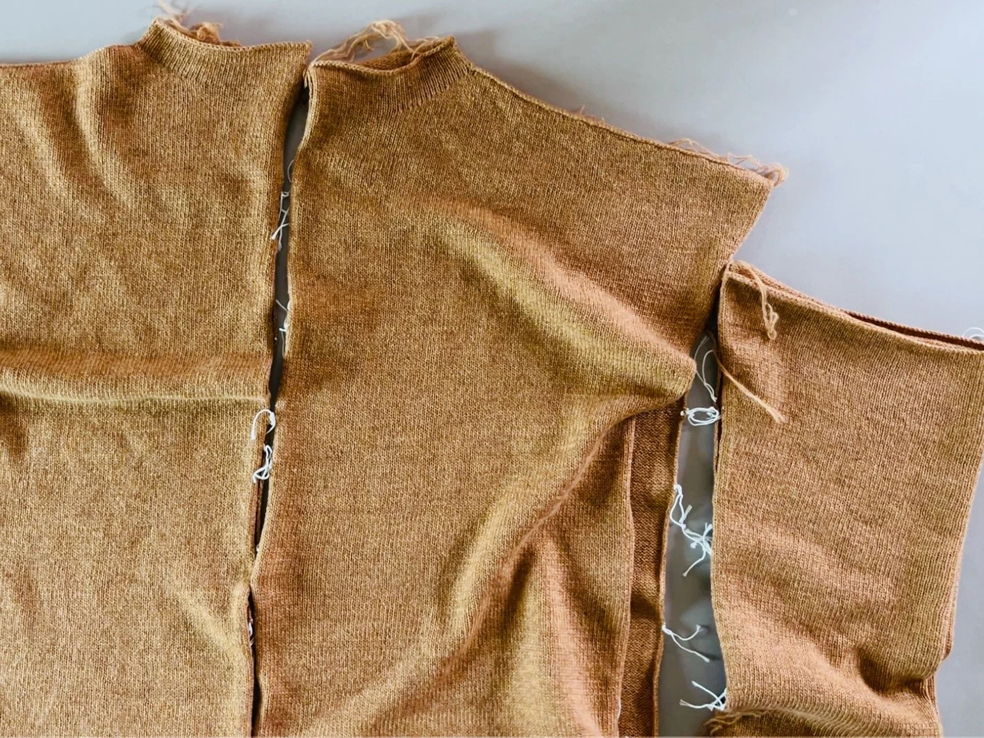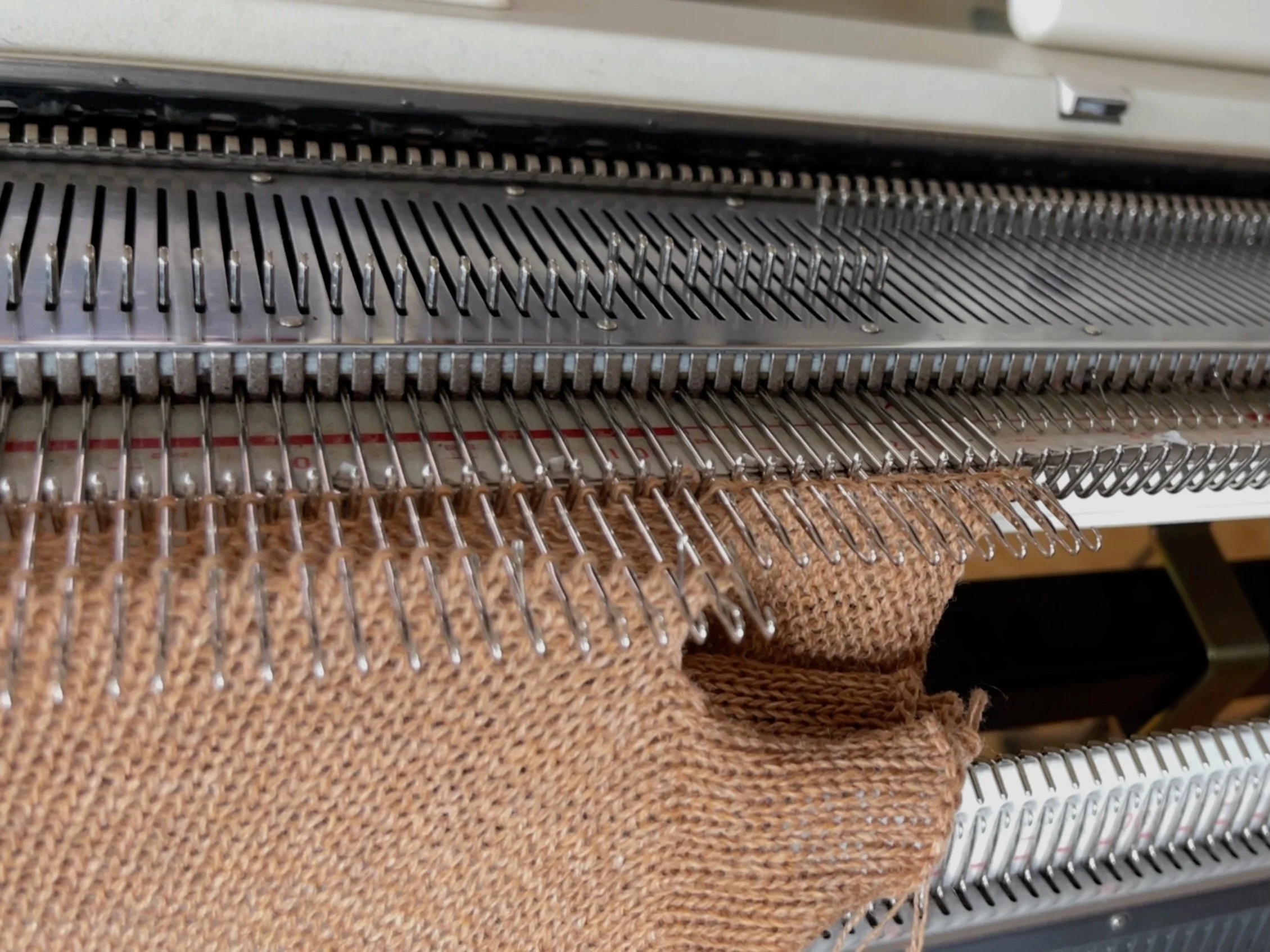 We will finish the garment by connecting the sleeves and body panels together, either by hand-sewing, rehanging on the machine or linking.